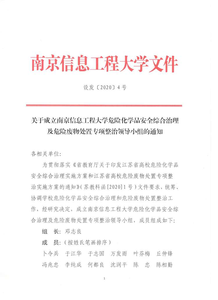 上一条:设发〔2020〕3号 关于成立南京信息工程大学特种设备安全工作领导小组的通知 下一条:设发〔2020〕2号 关于成立南京信息工程大学辐射安全工作领导小组的通知